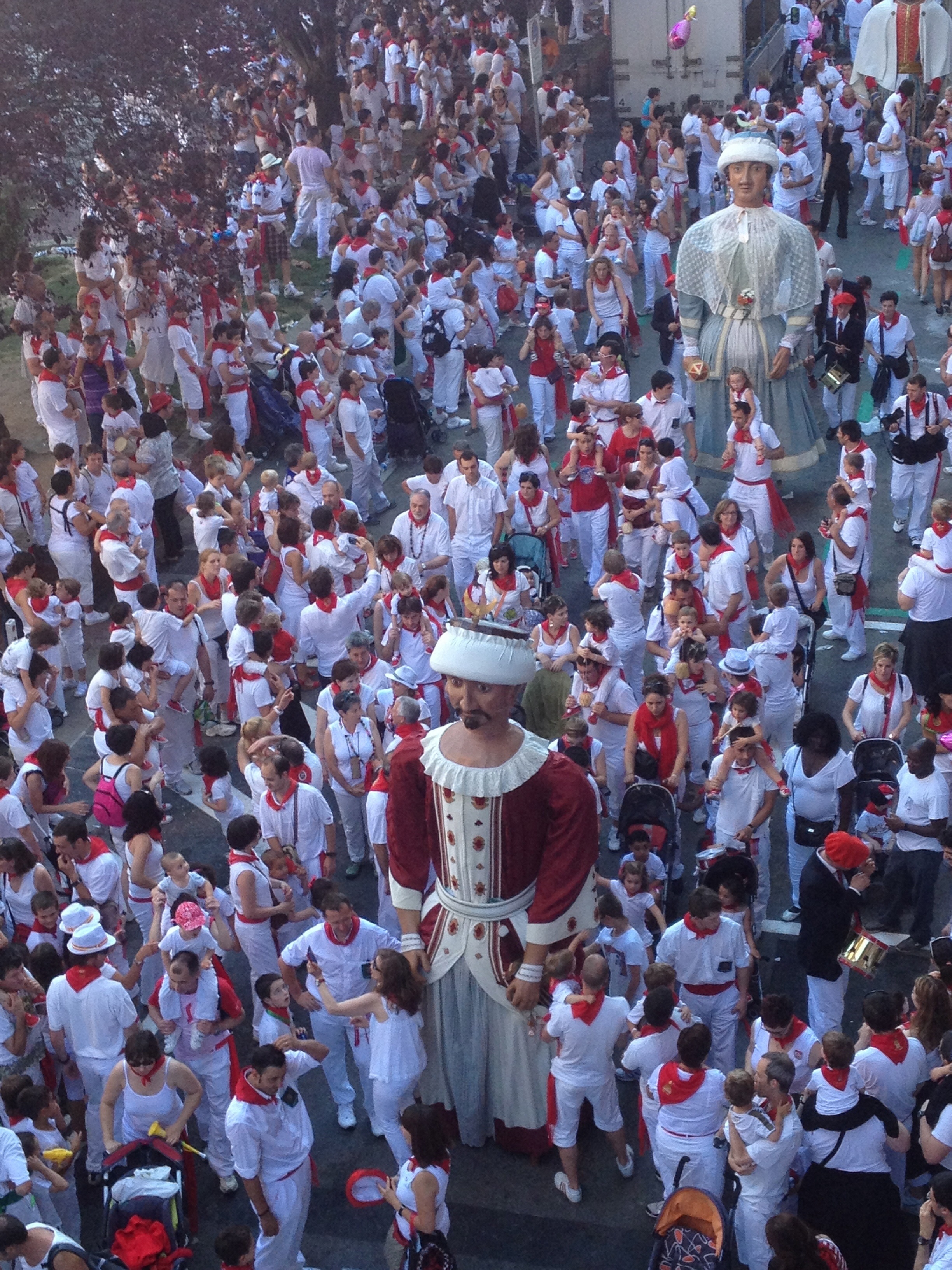 My street full of life during the San Fermin Fiesta in Pamplona, Spain. You can see the “giants” dancing and people following them. It’s an old tradition.